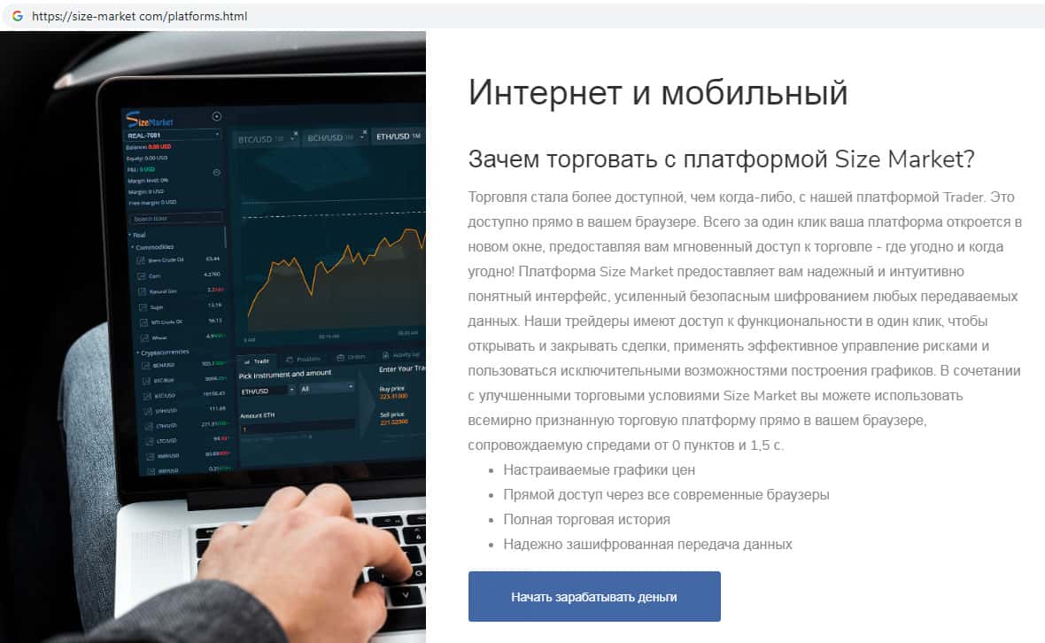 Мошенники SizeMarket расхваливают свой сайт как можно больше предлагая пользователям начать торговать на их сайте. Здесь аферисты вешают людям лапшу на уши, что их торговая платформа понятная и удобная, что она разработана как для компьютеров так и для мобильных устройств. Это шулера Сайз Маркет называют удобством пользования их дырявым сайтом.