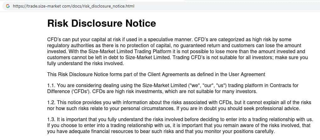 В уведомлении о рисках мошенническая организация Сайз Маркет указывает о том, что торговля на сайте сопряжена определенным уровнем риска. Соответственно данная брокерская компания не несет никакой ответственности за деньги утраченные клиентом на их фальшивом сайте. В данном случае шулера SizeMarket ссылаются на ошибочный выбор торговой стратегии клиента.