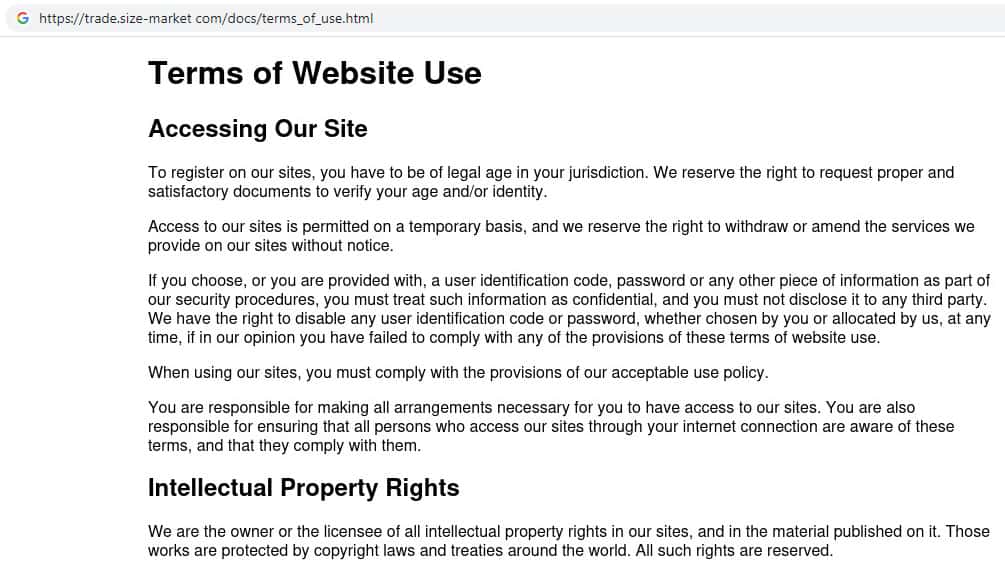 - Условия пользования сайтом брокерской конторы SizeMarket