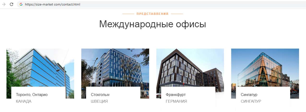 О местонахождении компании на официальном интернет-ресурсе брокерской конторы SizeMarket информации не замечено. Мошенники указывают лишь только то, что у их шараги якобы имеется несколько международных офисов, а именно в Канаде, Швеции, Германии и конечно же Сингапуре. Это конечно же все вранье !!!