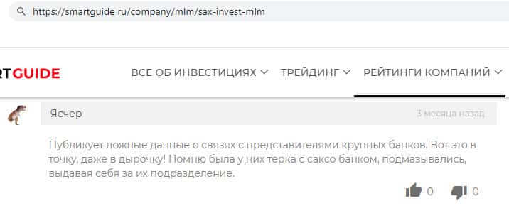 Пользователь с ником "Ясчер" написал отзыв о компании Сакс Инвест, в котором сообщает, что компания публикует ложную информацию о связи с представителями крупных банков. Так же он говорит, что у фирмы мошенников были проблемы с представителями "Саксо Банка", так как разводилы просто напросто выдавали себя за их подразделения, после тих проблем компания убрала эту информацию.