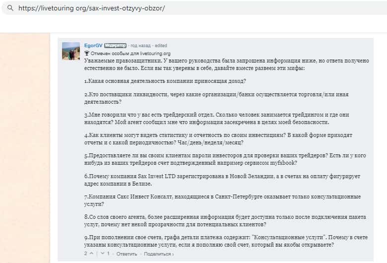 В одном из отзывов о компании аферистов SaxInvest Net пользователь сообщил, что компания не отвечает на вопросы, которые очень интересуют опытных пользователей. Что бы компания подтвердила свои серьёзные намерения, свою легальность был задан ряд вопросов, на которые компания принципиально не отвечает, так как ответа у неё нет.