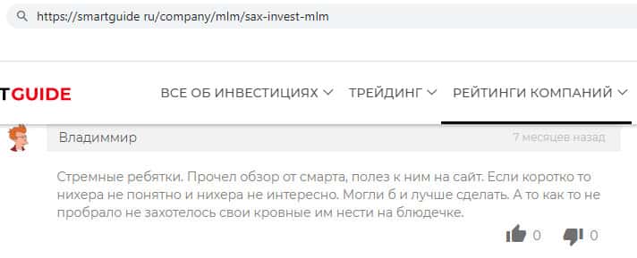 Компания мошенников SaxInvest Net пользователь назвал стрёмной в своём отзыве. Он рассказал. как почитал статью о фирме на одном интернет ресурсе, после чего решил посетить сайт компании, и оказалось, что там нет ничего интересного и всё непонятно. Он так же добавил, что компания могла сделать сайт получше, а то пользователя не впечатлило, так же он отказался инвестировать.