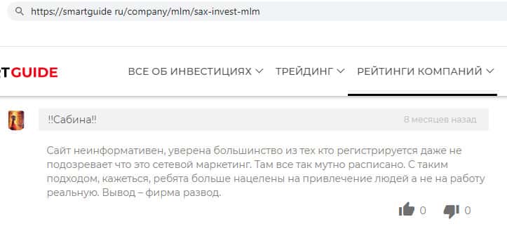 Некая "!!Сабина!!" написала отзыв о фирме мошенников Сакс Инвест, в котором написала, что сайт компании абсолютно неинформативен. Так же она уверена, что клиенты компании абсолютно не догадываются, что эта компания просто сетевой маркетинг, так как там слишком всё мутно. Фирма нацелена на привлечение большего количества людей, а не на работу.