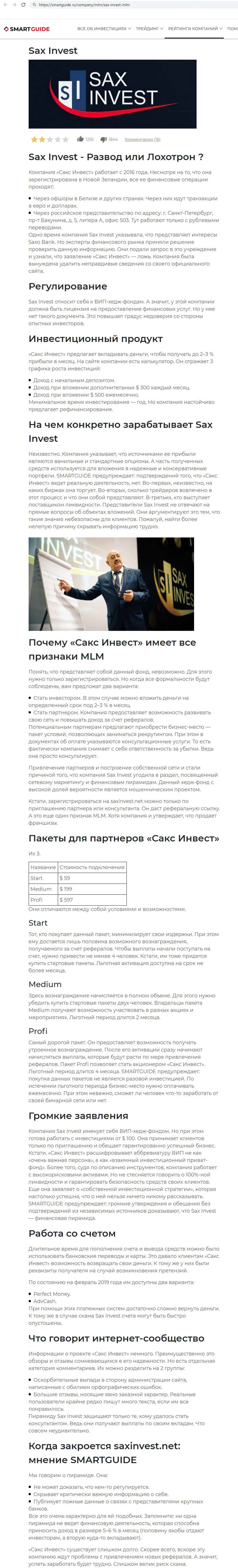 Так же не безызвестный сайт смартгид ру - написал статью в компании аферистов Сакс Инвест, в которой выявил мошенничество со стороны фирмы. Так же сайт интересуется, когда же данные жулики уже закроются, так как на это есть множество причин, такие как: фирма не регулируется, скрывает важную информацию о себе, а самое главное, что публикует ложную информацию о их связи с крупными банками.
