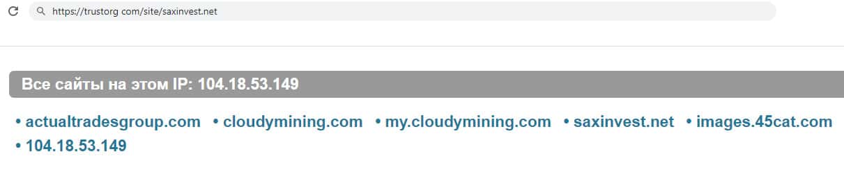 Мы проверили сайт компании кидал через авторитетный интернет ресурс для проверки сайтов "Доверие в Сети". Выяснилось, что на одном айпи компании жуликов SaxInvest Net существует ещё несколько сайтов. Порядочная организация не может себе такого позволять, фирма просто разместила свои проекты на одном айпи, надеясь, что никто не проверит.