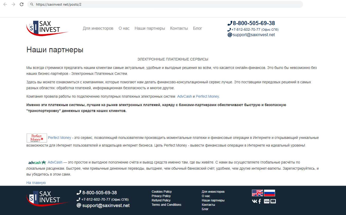 Так же на сайте мошенников Сакс Инвест есть раздел с информацией о партнёрах компании. Этими партнёрами являются две компании, по словам жуликов это популярные платёжные электронные системы AdvCash и Perfect Money. Но на просторах интернета полно информации о том, что это мошенники и разводят людей на деньги, и не удивительно, если окажется, что это всё одни и те же люди.