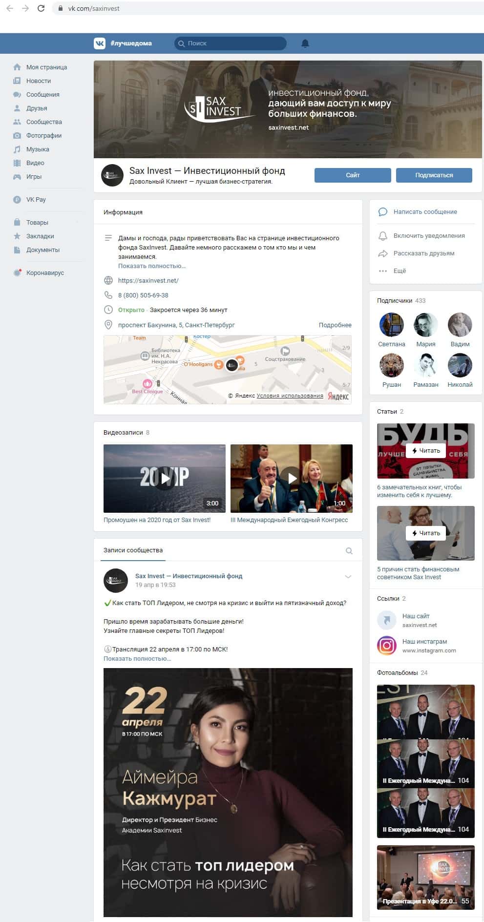 Вконтакте так же не остался без внимания со стороны мошенников SaxInvest Net. Они так же завели здесь страницу, которая на сегодняшний день насчитывает 433 подписчика. Фирма всеми обманными путями старается завлечь клиентов, и заставить их вносить деньги, но эти подписчики видимо не в курсе мошенничества компании, иначе давно бы отписались от неё.