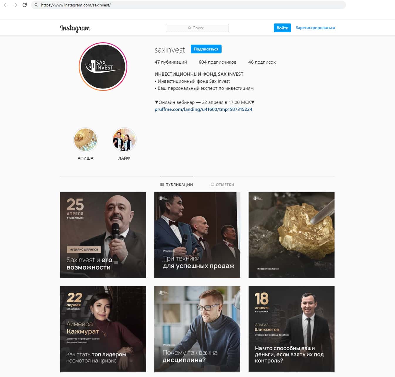На всемирно известном фотохостинге - инстаграм так же присутствует страница махинаторов Сакс Инвест, там кидалы набрали 604 подписчика. Это не такое большое число, но в тоже время очень не малое, так как каждому из этих людей, компания промывает мозг, и настойчиво просит инвестировать деньги.