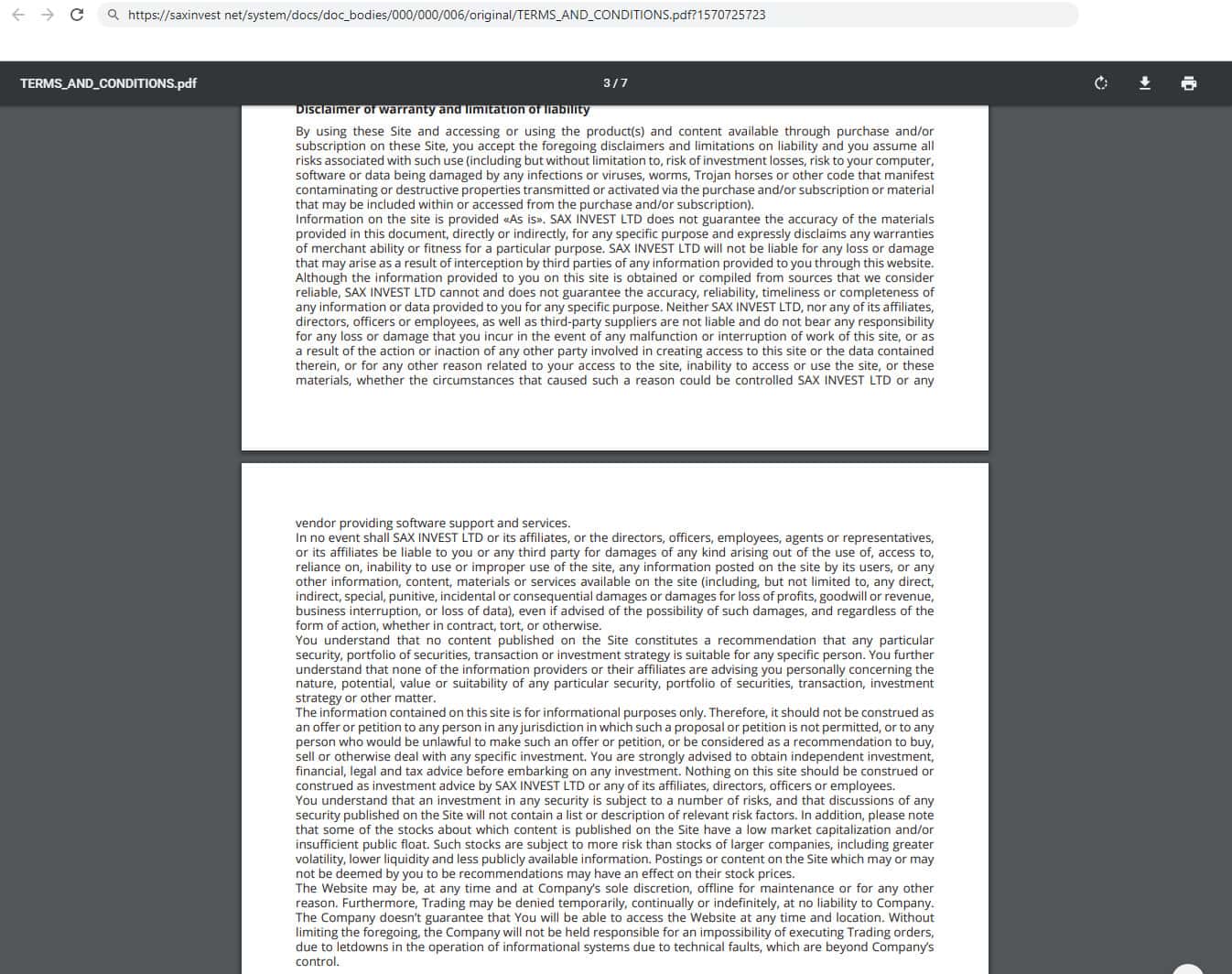Жулики SaxInvest Net предоставили отказ от ответственности, который полностью противоречит обещанием компании. Компания снимает с себя всю ответственность за все свои услуги, и не несёт никакой ответственности за деньги клиентов. Прежде чем доверять какому нибудь инвестиционному фонду нужно перечитать всю документацию связанную с ним.