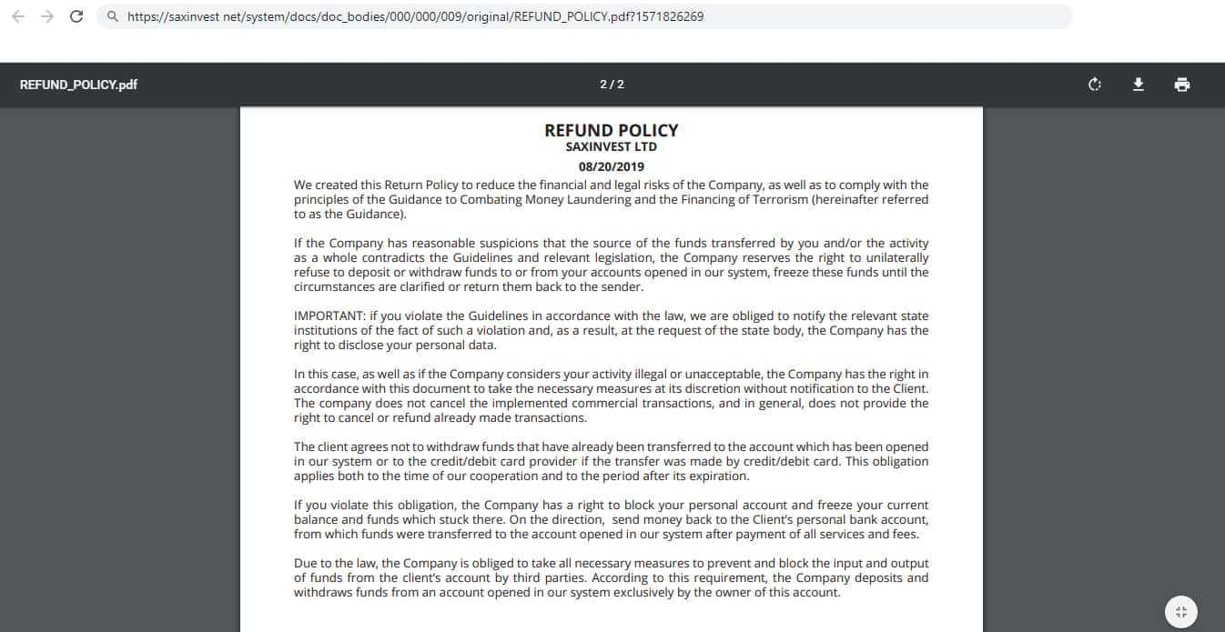 Компания кидал Сакс Инвест предоставила политику возврата средств, но вот только там есть ужасающие пункты, в которых компания говорит, что клиент не имеет права снимать деньги с открытого счёта, которые он инвестировал, за нарушение данного правила, компания блокирует счета клиента. Фирма прямо говорит о том, что не вернёт деньги клиенту.