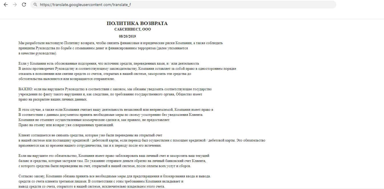 Мы сделали перевод политики возврата компании аферистов Сакс Инвест на Русский язык.