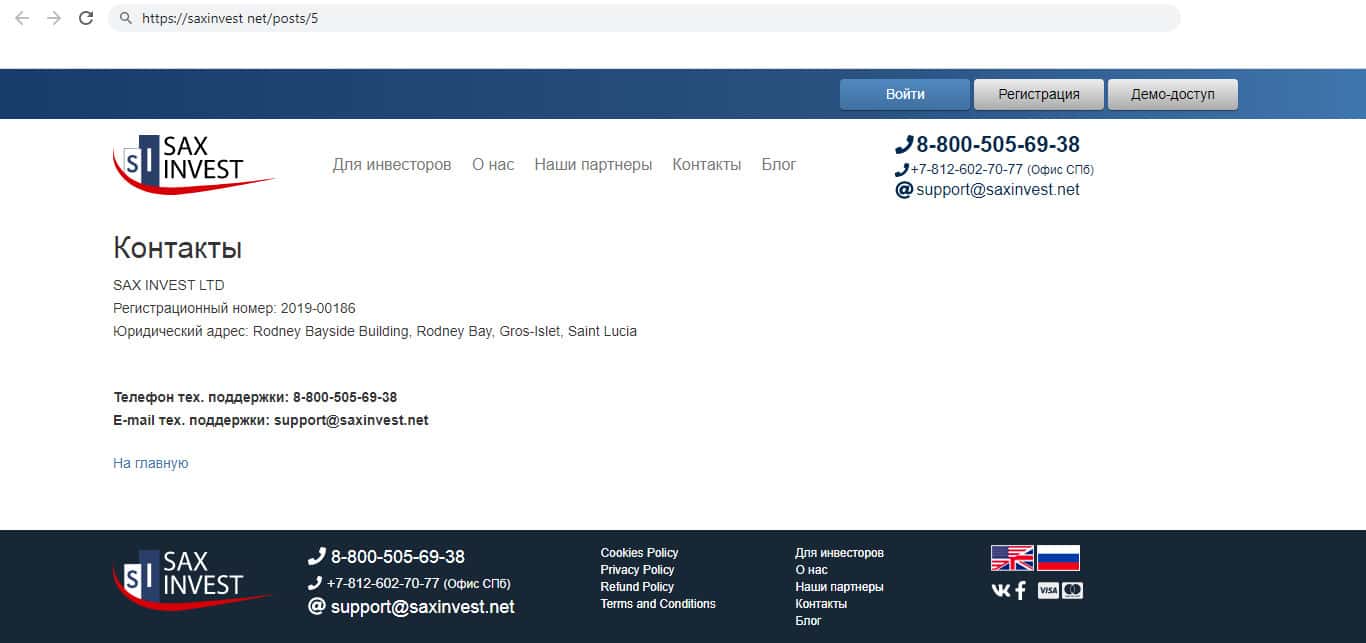 На своём главном сайте карманники SaxInvest Net предоставили контактную информацию. Фирма указала номер телефона, юридический адрес, электронную почту. Но самое странное то, что указан офис в Санкт-Петербуре, но точного адреса никто не указывает, сказано, что якобы есть офис в этом городе и всё. Контактные данные компании: