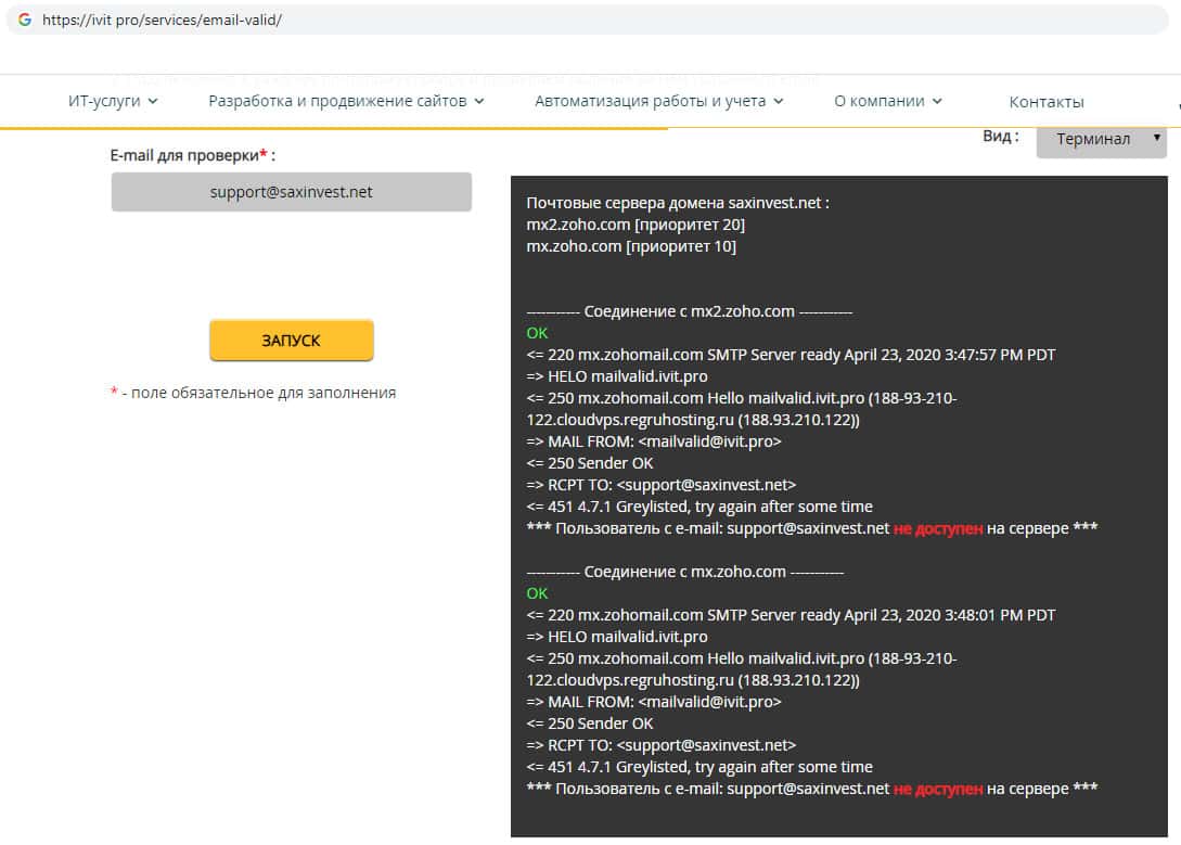 Так же мы проверили существование электронной почты компании аферистов Сакс Инвест, как и ожидалось - почты нет. Фирма не указала даже почту для связи с ними. Мошенники видимо на отрез отказываются общаться с клиентами, так как те будут только жаловаться, а компании это не нужно, для них все пользователи одноразовые.