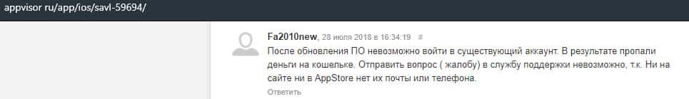 Далее представлено еще одно замечание в виде негативного отзыва, касательно того, что после обновления программного обеспечения невозможно войти в свой существующий аккаунт. Там остались деньги на кошельке и человек никак не может решить свою проблему - техническая поддержка конторы Савл молчит.