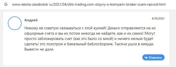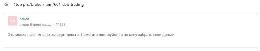 В данном разделе предоставлены пользовательские отзывы о том, что скам-брокер CBB Trading не выплачивает обещанную прибыль и не выводит средства со счета.