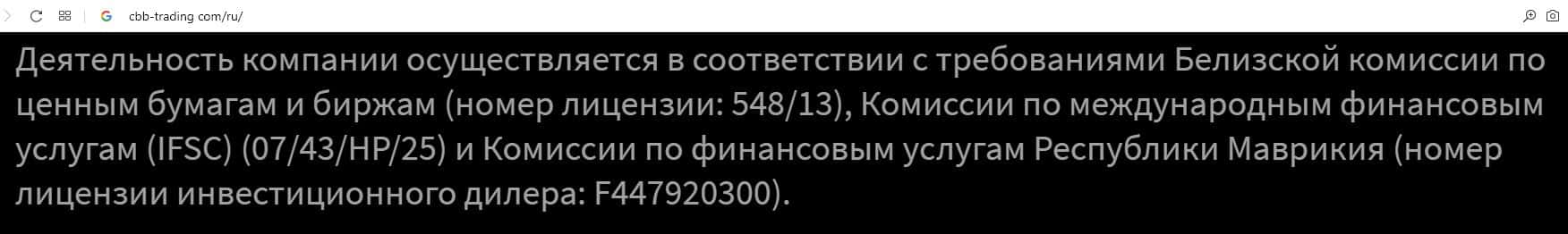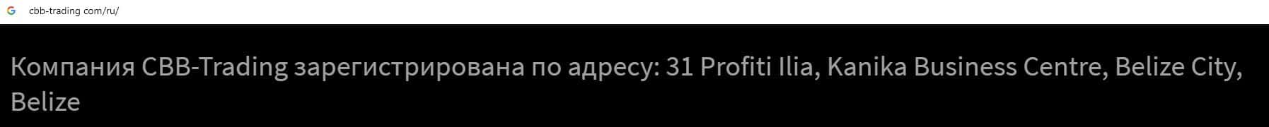 Местом регистрации CBB Trading является оффшорное государство Белиз, где зарегистрировано огромное количество аналогичных онлайн-лохотронов.