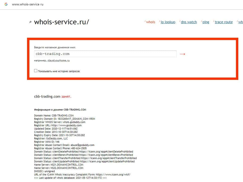 Данные о владельце домена обманщиков CBB Trading отсутствуют