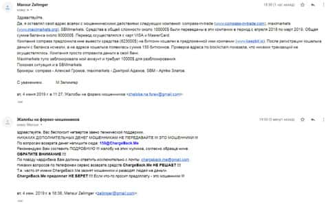 Еще один человек оставил свой е-мейл для связи, так как контора СБМ Маркетс провела мощнейшую форекс-схему по вытягиванию всех сбережений клиента вместе со своими пособниками: Компасс Ин Трейд и Макси Маркетс. На этот раз жуликам удалось вытянуть 100 000 долларов. И эту сумму способна только вернуть служба ChargeBack.Me