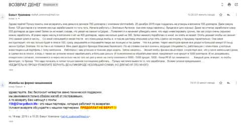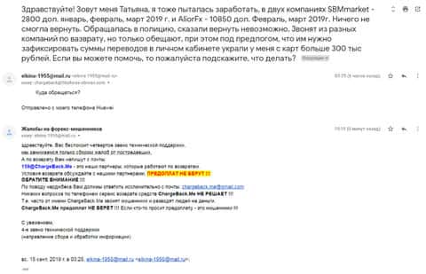 Еще одну женщину, мошенники дилинговой кухни СБМ Маркетс обворовали на небольшую сумму, но все же тоже неприятно терять ее, тем более когда на этом наживаются аферисты форекс-конторы. Обычно в таких случаях пишут подробную жалобу в компанию ChargeBack.Me где знают как проводить возвраты средств, которые незаконно присвоила себе форекс-компания.
