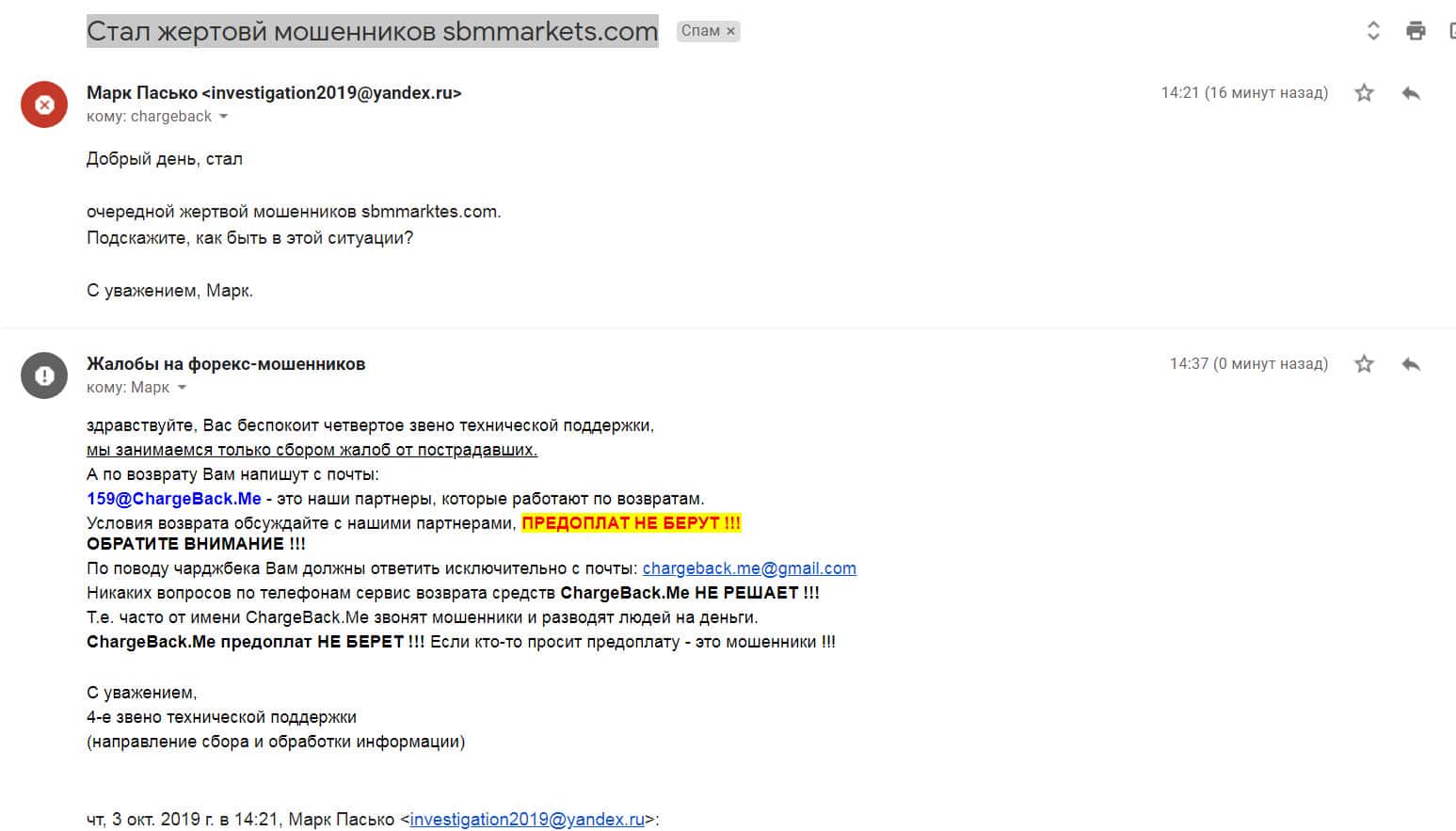 Очередной человек жалуется на скам-проект СБМ Маркетс. Мужчине написали аферисты на почту, и уверяя в том, что он получит горы золота, заставили вложить деньги. Первое время всё шло хорошо, но, когда аферисты начали требовать больше вложений, жертва ответила отрицательно, после чего жулики попросту пропали и перестали выходить на связь.