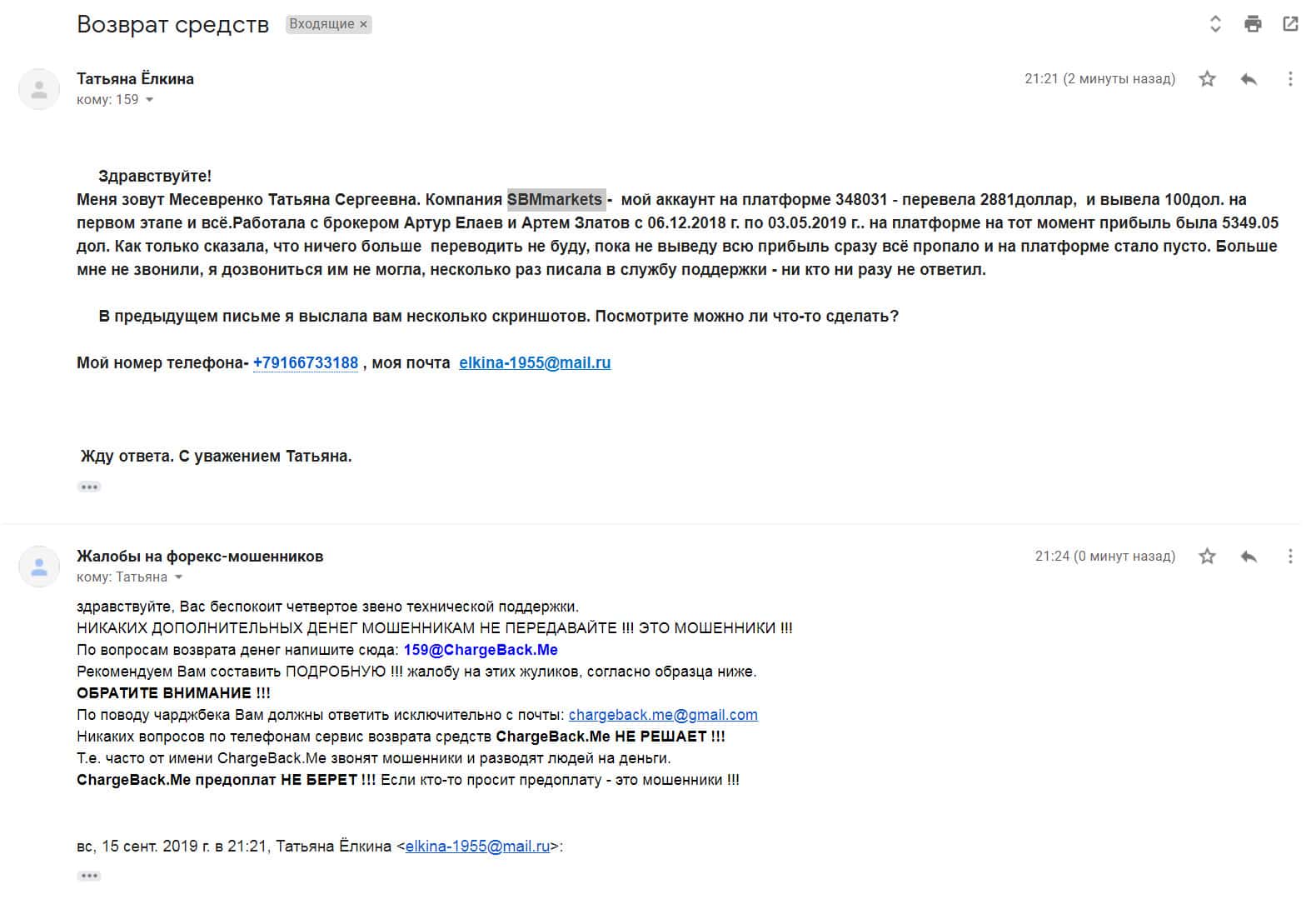 И снова женщина рассказала как она глубоко ошиблась в выборе брокера для торговли. На этот раз она связалась с жуликами SBMMarkets где мошенникам удалось выманить около 2500 долларов которые они украли. По совету знакомых она написала на веб-ресурс ChargeBack.Me чтобы вернуть деньги.