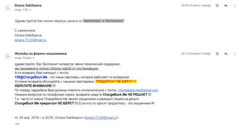 В компанию по возврату средств из мошеннических контор под названием ChargeBack.Me обратилась одна женщина, которая попалась на удочку сразу в две форекс-кухни. Сначала она вложила деньги в лохотрон СБМ Маркетс и когда депозит там слили, то решила отыграться уже у другого брокера MaxiMarkets, который также оказался мошенническим. Так все сбережения она и потеряла.