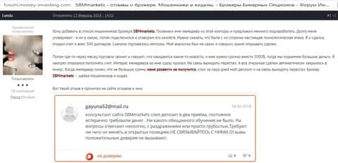Пользователь одного из форумов по инвестициям так же предостерегает остальных пользователей. Как уже говорилось, мошенники SBMMarkets постепенно, не спеша, разводят клиентов на всё большие и больше суммы денег. Вывести их у клиентов уже не получится, ведь мошенническая контора СБМ Маркетс работает только на ввод средств и развод своих клиентов.