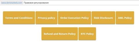 На сайте в разделе правового регулирования мы ожидали увидеть что-то, хоть отдалённо напоминающее лицензию. К сожалению, ничего такого там нет. Только обычные предупреждения о рисках и договора, которые гении SBMMarkets даже не удосужились перевести на русский язык. Отсутствие же лицензии означает, что никакого права на законную деятельность у СБМ Маркетс попросту нет.