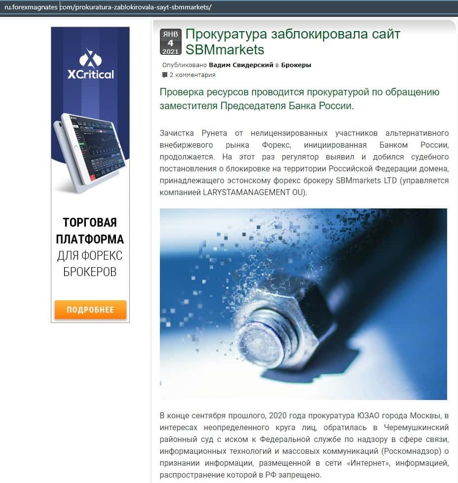 В данной публикации описывается, что контора СБМ Маркетс, а также ее сайт был заблокирован прокуратурой. Она ведет шулерскую деятельность по отношению к клиентам.