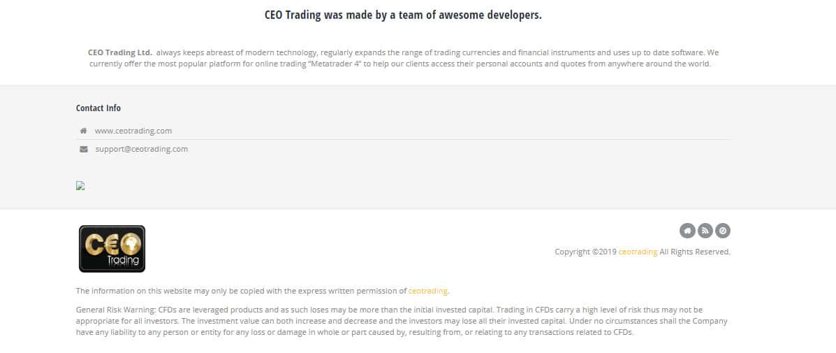 Скрытность руководства фирмы CEO Trading как ещё одно доказательство "темноты" в этой организации. На их основном сайте нет абсолютно никакой информации об сотрудниках и руководстве, что делает их абсолютно не заметными и анонимными при действиях в сети. Вам просто на просто не о ком будет говорить в случае утраты денежных средств в компании.