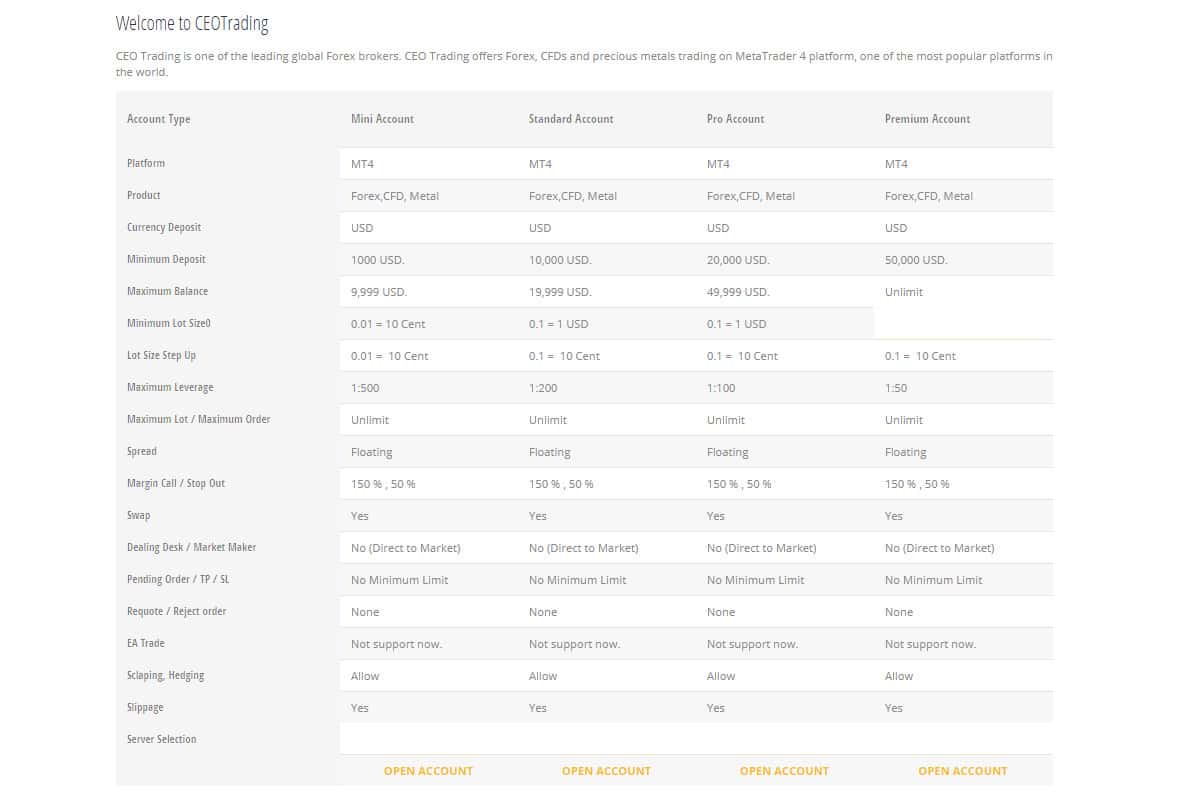 Спускаясь ниже по сайту мошенников СЕО Трейдинг, можно увидеть их минимальный и максимальный счет и размер депозита, который Вы можете держать и вкладывать в это дело. Так же, указаны продукты торговли и платформа, на которой проводятся разводы на деньги, и так далее. На самом деле, ничем не отличающаяся система и схемы развода на сайте.