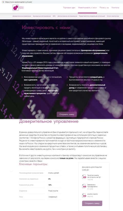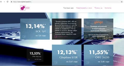 Если вы думаете, что на сайте SeptemCapital вам предоставят подробную информацию об условиях торговли, то вы сильно ошибаетесь. Кроме общих завлекаловских фраз, типа, вложив в облигации определенную сумму, вы получите с нее достойный доход, здесь нет больше практически ничего.