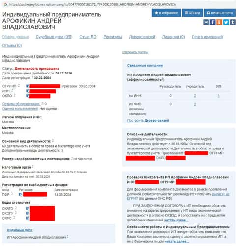 Информация о члене команды SeptemCapital Андрее Арофикине в базе zachestnyibiznes ru показывает его действительный статус – с 2016 года он не является индивидуальным предпринимателем. Также не числится он учредителем конторы Кучкина, а является создателем двух контор с низким уровнем доверия.