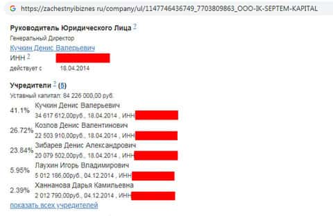 Компания SeptemCapital и не скрывает своего владельца, им является Кучкин Денис Валерьевич. Кроме того, есть еще 5 учредителей организации, между которыми распределены акции конторы. Из данных на портале зачестныйбизнес ру видим, что уставный капитал составляет ни много ни мало – 82 миллиона рублей.