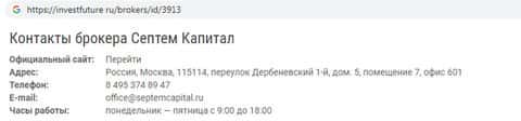 Профиль конторы SeptemCapital на сайте investfuture ru содержит иной адрес: Москва, 115114, переулок Дербеневский 1-й, дом. 5, помещение 7, офис 601. Явно, что владельцы конторы что-то скрывают от своих пользователей, что характеризует их явно не с лучшей стороны.