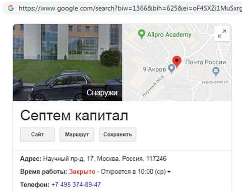 Более того, при поиске в системе Google высвечивается третий адрес конторы SeptemCapital: Научный проезд, 17, Москва, 117426. Утаивание информации от пользователей и наглый обман даже в таких мелочах, как место расположения, вполне в духе этих мошенников.