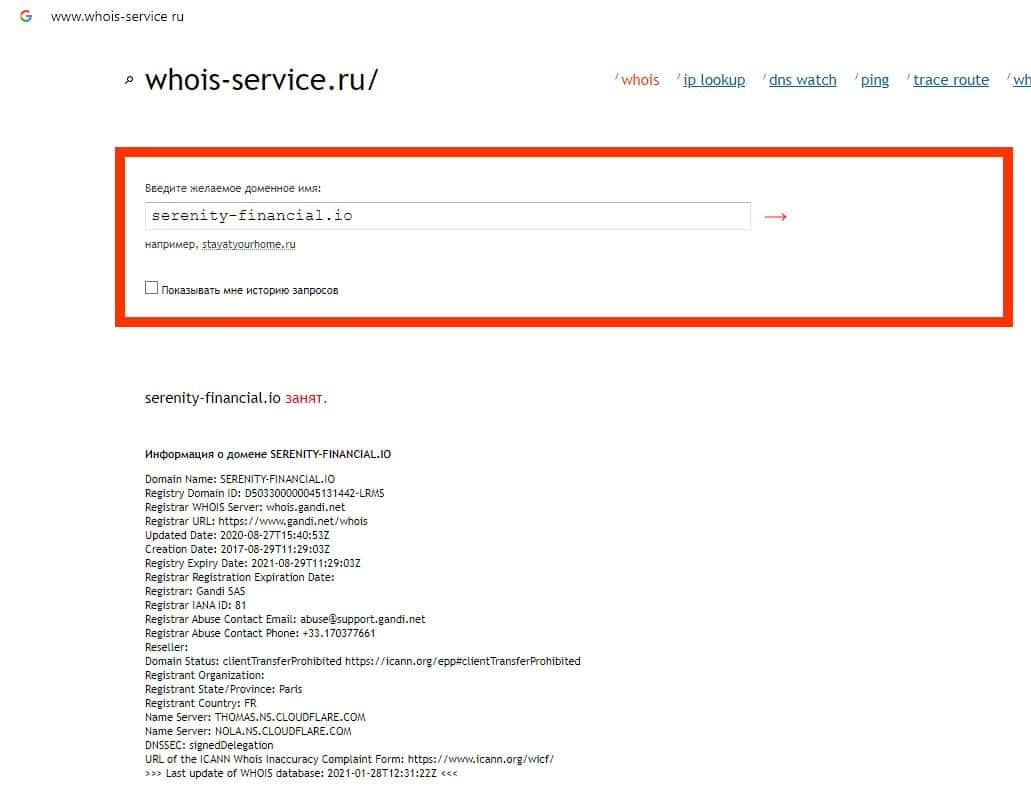 Проведя анализ данных по сайту Serenity Financial, не было обнаружено информации о владельце домена, что является еще одним признаком того, что имеем дело с лохотроном.