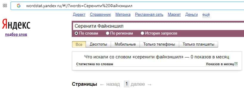 О брендовых запросах названия компании на русском языке "Серенити Файнэншил" на Яндекс Вордстарт ничего не известно.