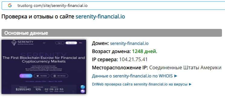 Проверка интернет-портала шулеров Serenity Financial на trustorg com показала, что возраст домена к моменту написания статьи составляет 1248 дней, вероятно домен купленный.