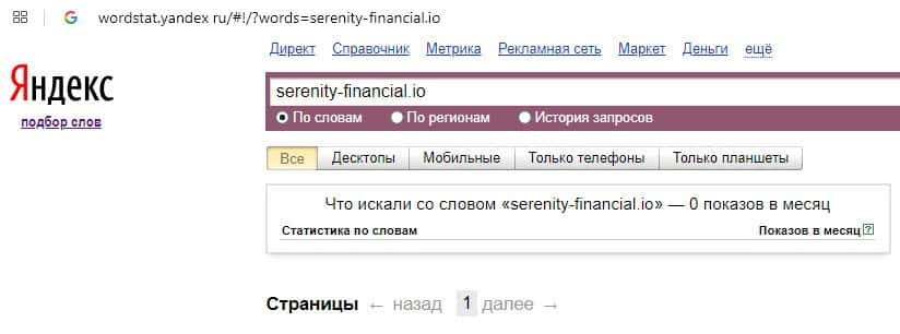 О запросах по бренду название домена компании "serenity-financial.io" на Вордстарт Яндекс Ру информация отсутствует.