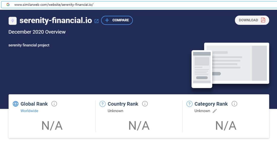При проверке источников бренда по странам компании Серенити Файнэншил на сайте similarweb com, информация отсутствует, что является признаком фейкового лохотрона.