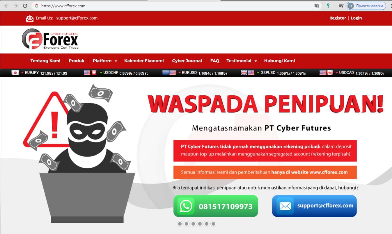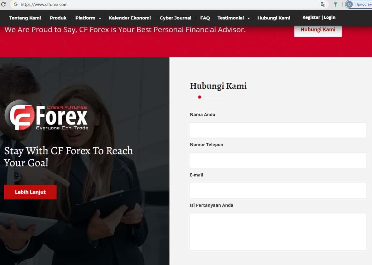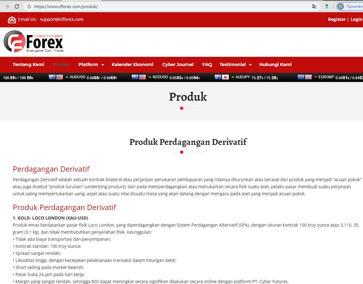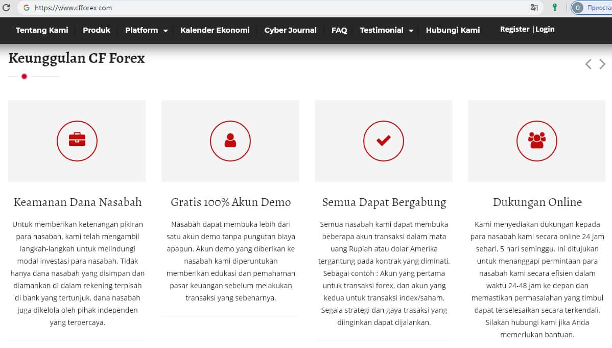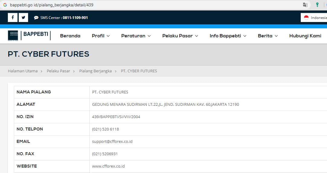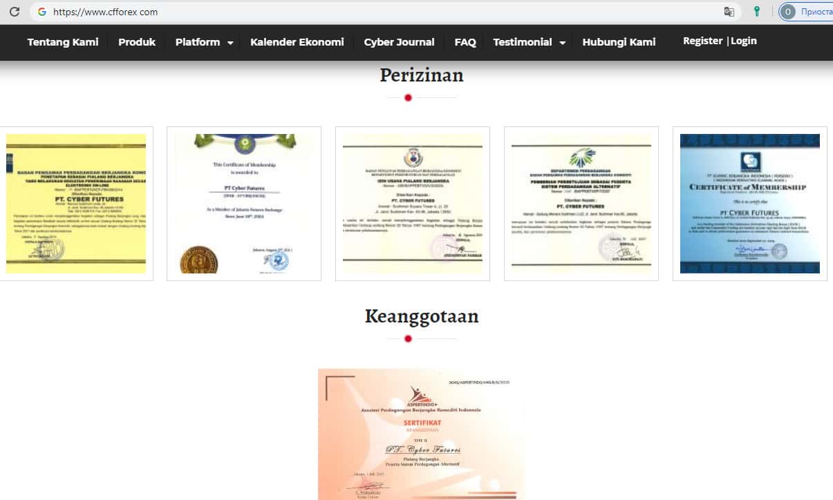 При попытке доступа к порталу, имеющему официальную регистрацию идет переадресация на сайт домена com. Так же в сети существует ещё один "отпрыск" индонезийского брокера PT Cyber Futures, ссылающийся на все те же регистрационные документы. Он имеет похожее наименование: cfforex id.
