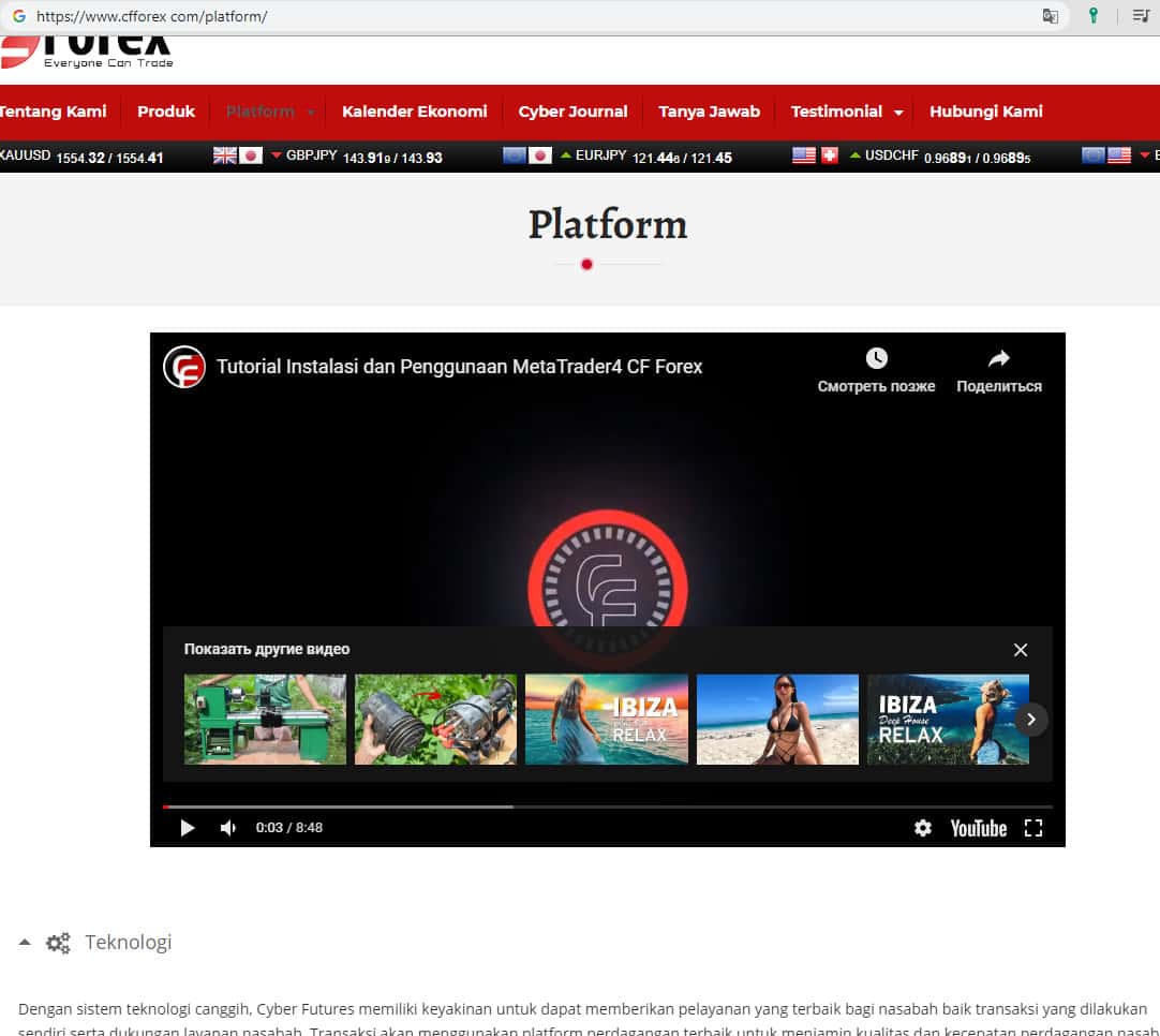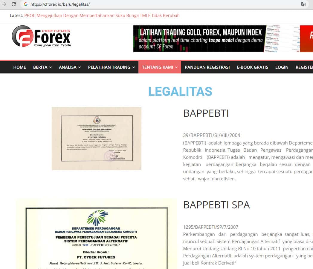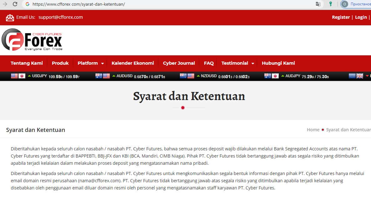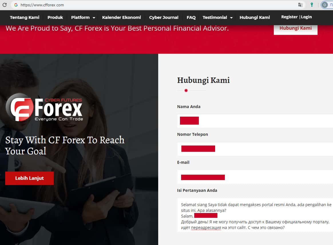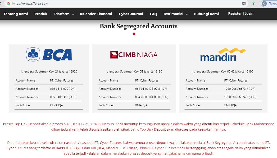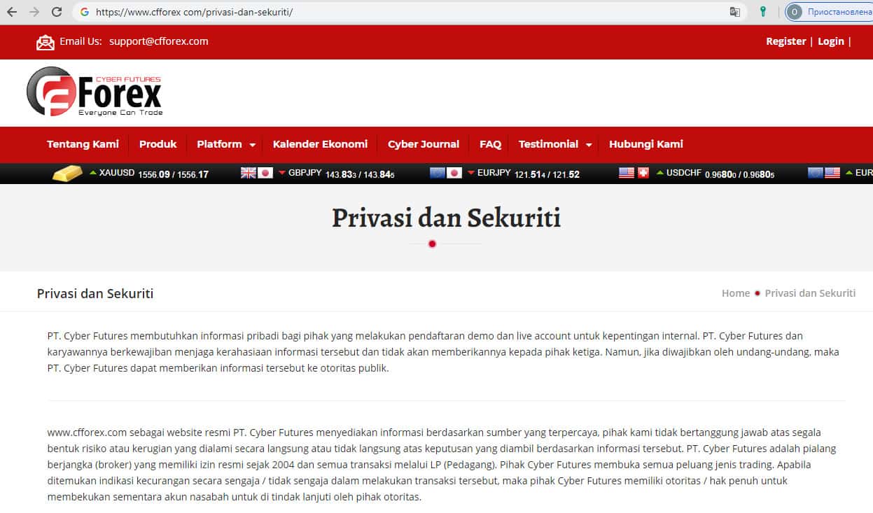 При попытке доступа к порталу, имеющему официальную регистрацию идет переадресация на сайт домена com. Так же в сети существует ещё один "отпрыск" индонезийского брокера PT Cyber Futures, ссылающийся на все те же регистрационные документы. Он имеет похожее наименование: cfforex id.