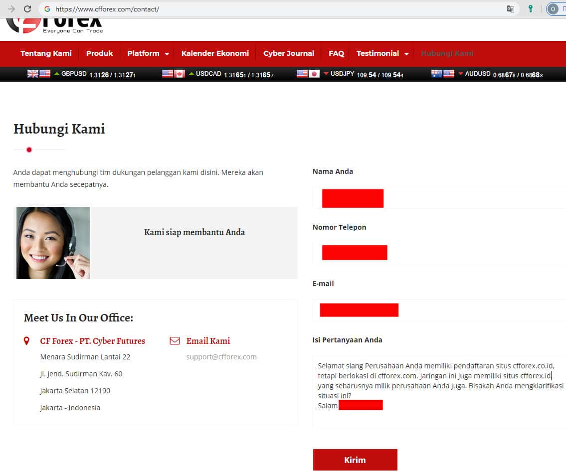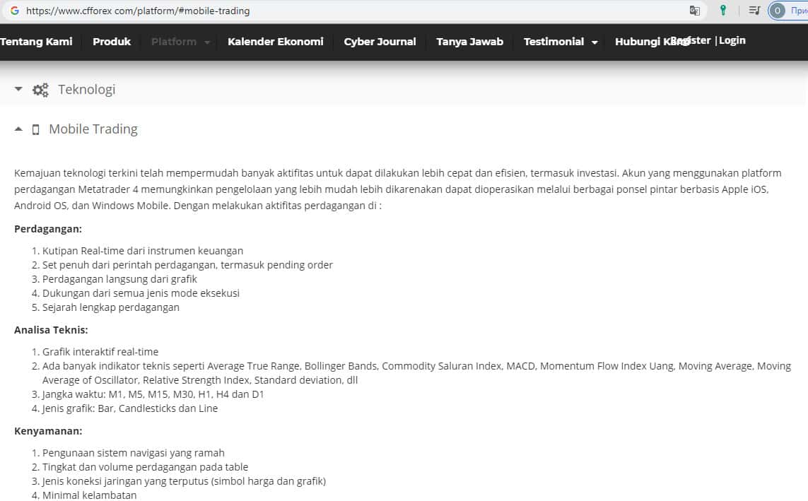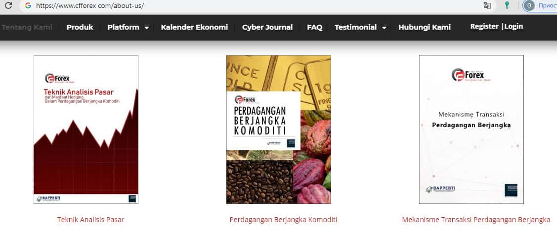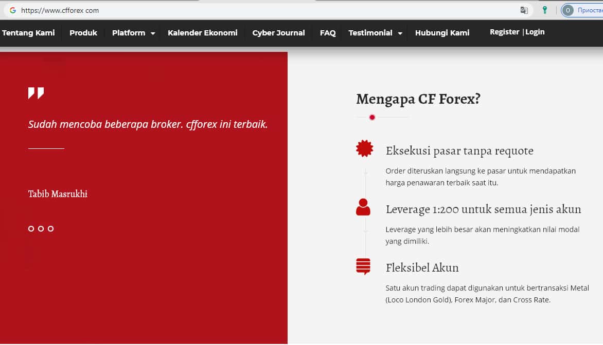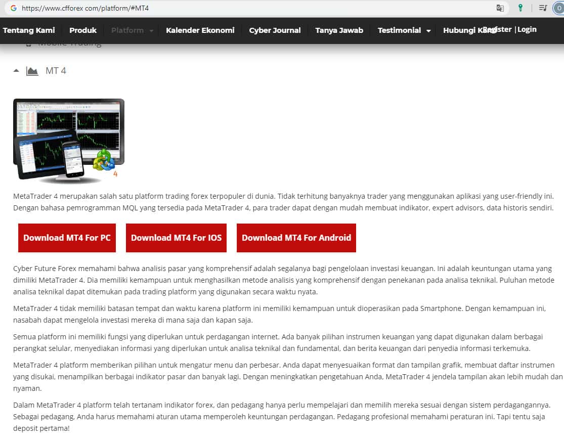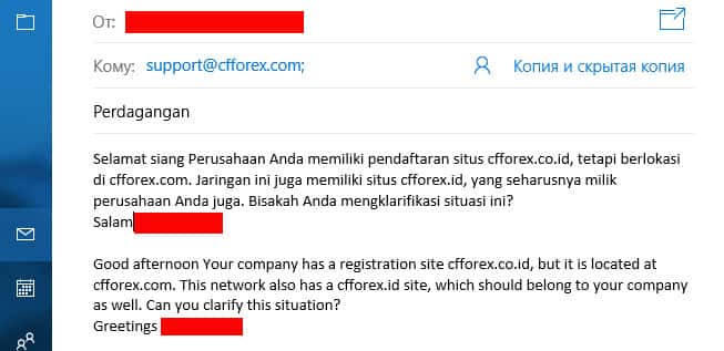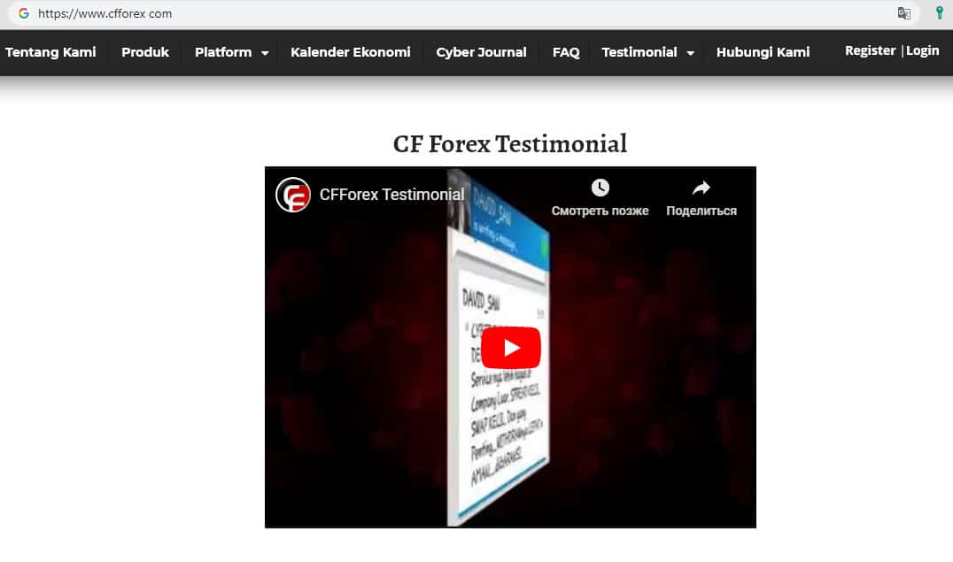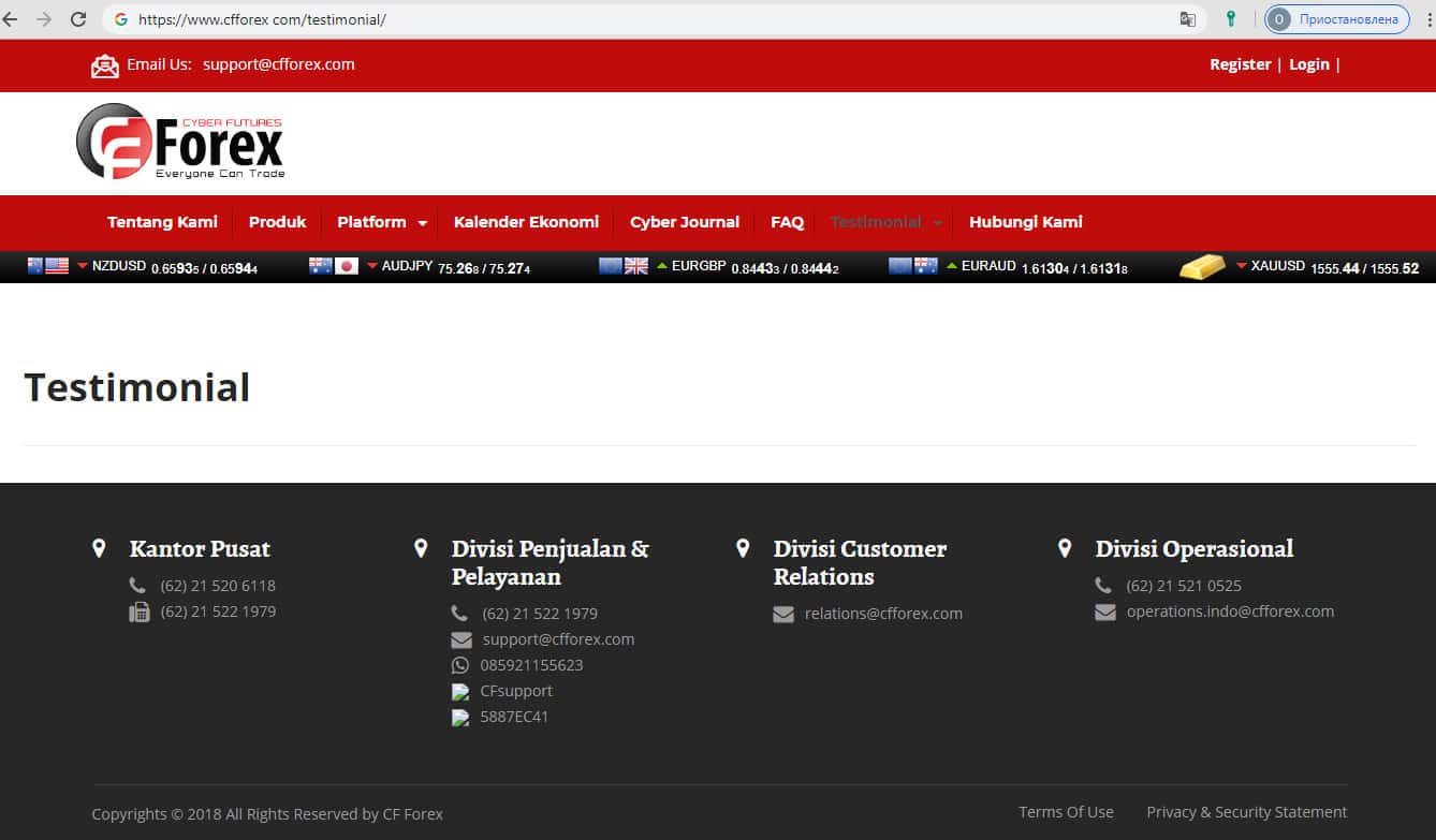 При попытке доступа к порталу, имеющему официальную регистрацию идет переадресация на сайт домена com. Так же в сети существует ещё один "отпрыск" индонезийского брокера PT Cyber Futures, ссылающийся на все те же регистрационные документы. Он имеет похожее наименование: cfforex id.