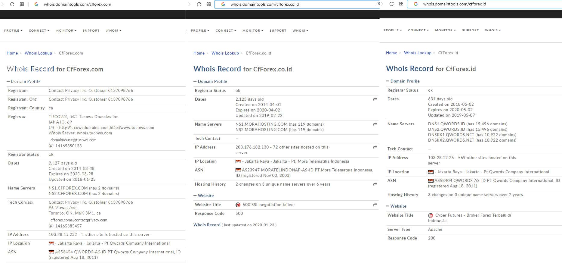 Всё выглядит довольно презентабельно и правдиво. Дело в том, что компания PT Cyber Futures действительно имеет регистрацию в этих финансовых организациях. Но есть маленький нюанс. В регистрационных данных официальным сайтом компании PT Cyber Futures является cfforex.co id, а не cfforex com. Но все операции проводятся через сайт cfforex com. Спрашивается, для чего?