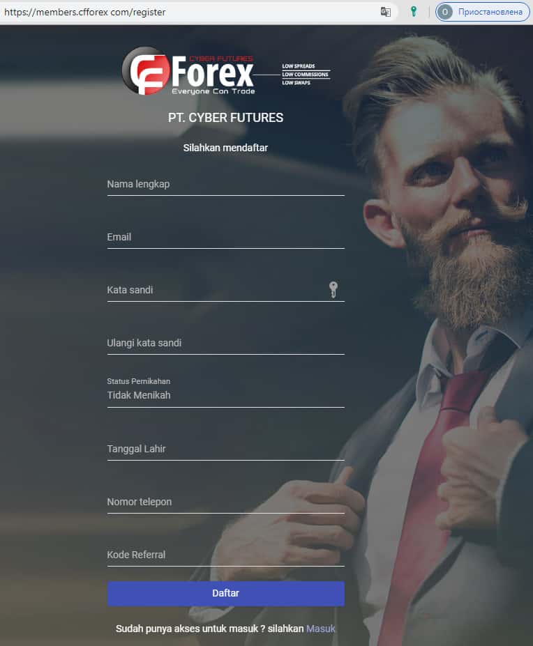Даже при регистрации нового трейдера на портале CF Forex ничего не известно о условиях трейдинга
