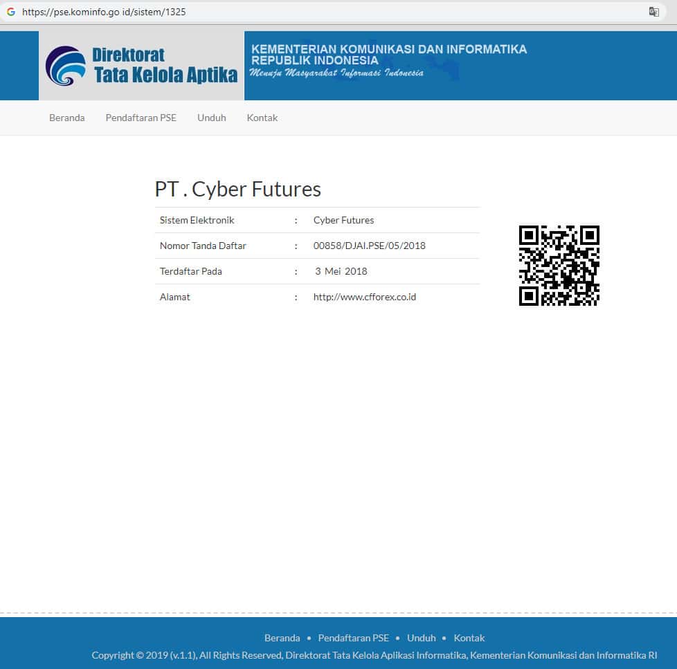 Здесь же находится ссылка, при переходе по которой на сайт министерства связи и информационных технологий Индонезии, мы убеждаемся в принадлежности портала cfforex.co id компании PT Cyber Futures, а о сайте cfforex com опять нет ни слова.
