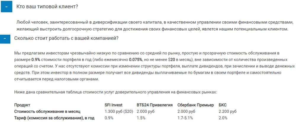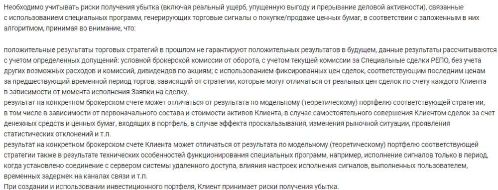 При этом наперсточники СФИ Инвест не забывают упомянуть о существующих рисках, чтобы потенциальные жертвы понимали, что в случае исчезновения денег со счетов, виноваты будут только они сами. Стоимость обслуживания так называемого портфеля невысокая, всего 0,9% его стоимости в год, причем за дополнительные операции комиссию не берут.