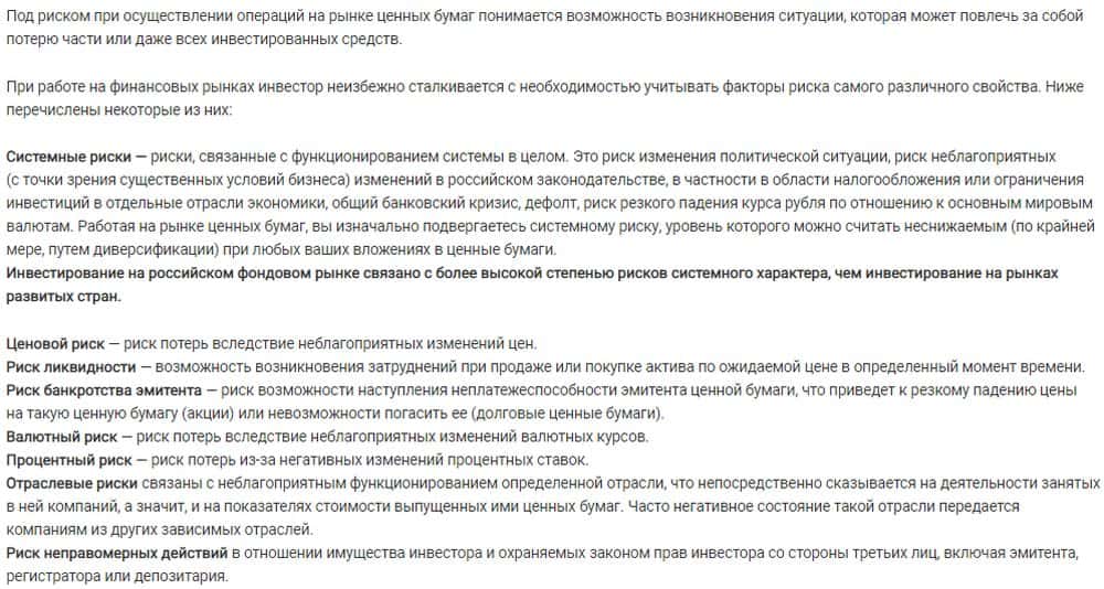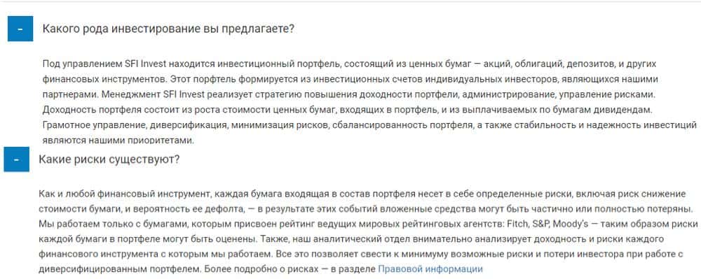 Дальше, само собой, идет предупреждение о рисках. Каталы SFI Invest предупреждают инвесторов, что объявленная им надежность и диверсифицированность "портфеля" - понятие относительное, и клиенту лучше готовится к потерям сразу. Понятно, что этот пункт прописан для решения возможных претензий и судебных споров - мол, знали, на что шли.